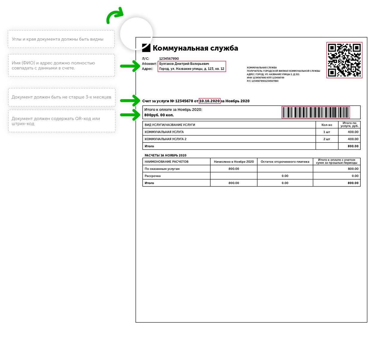 11. Банковские выписки могут быть приняты только при наличии QR-кода, или штрих-кода, или печатей и подписей уполномоченных сотрудников банка, счета за коммунальные услуги следует загружать вместе с чеком об оплате счета. Если на квитанции есть штрих код или QR код, то загружать чек об оплате не требуется.