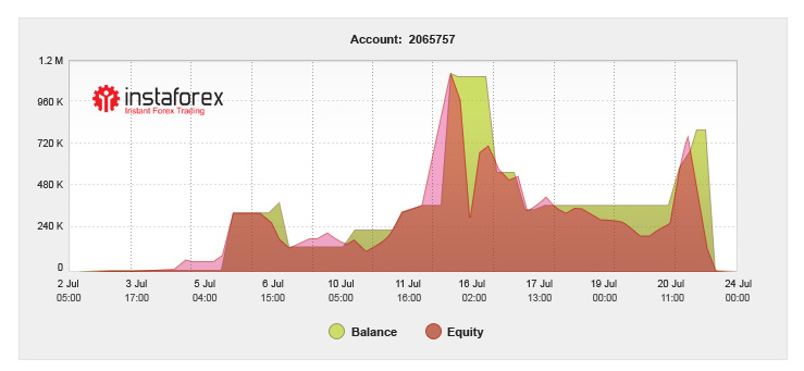 The chart shows the balance of #2065757 live trading account. Within the first two weeks of July, the account holder earned over one million US dollars with the initial deposit slightly more than one thousand US dollars. Eventually, the account balance was running $1162092.42. The second half of July appeared to be far less successful for the customer: he lost all his profit.